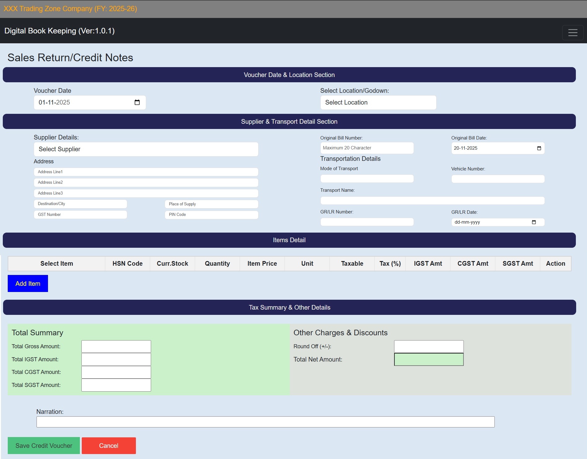 Credit/Debit Note Window
